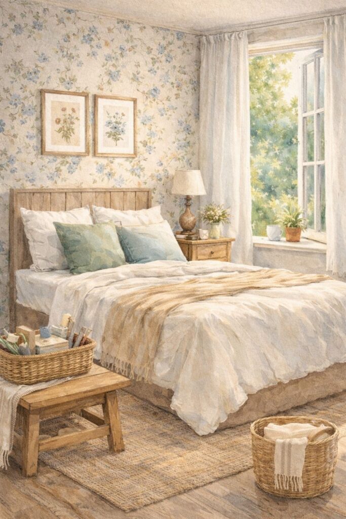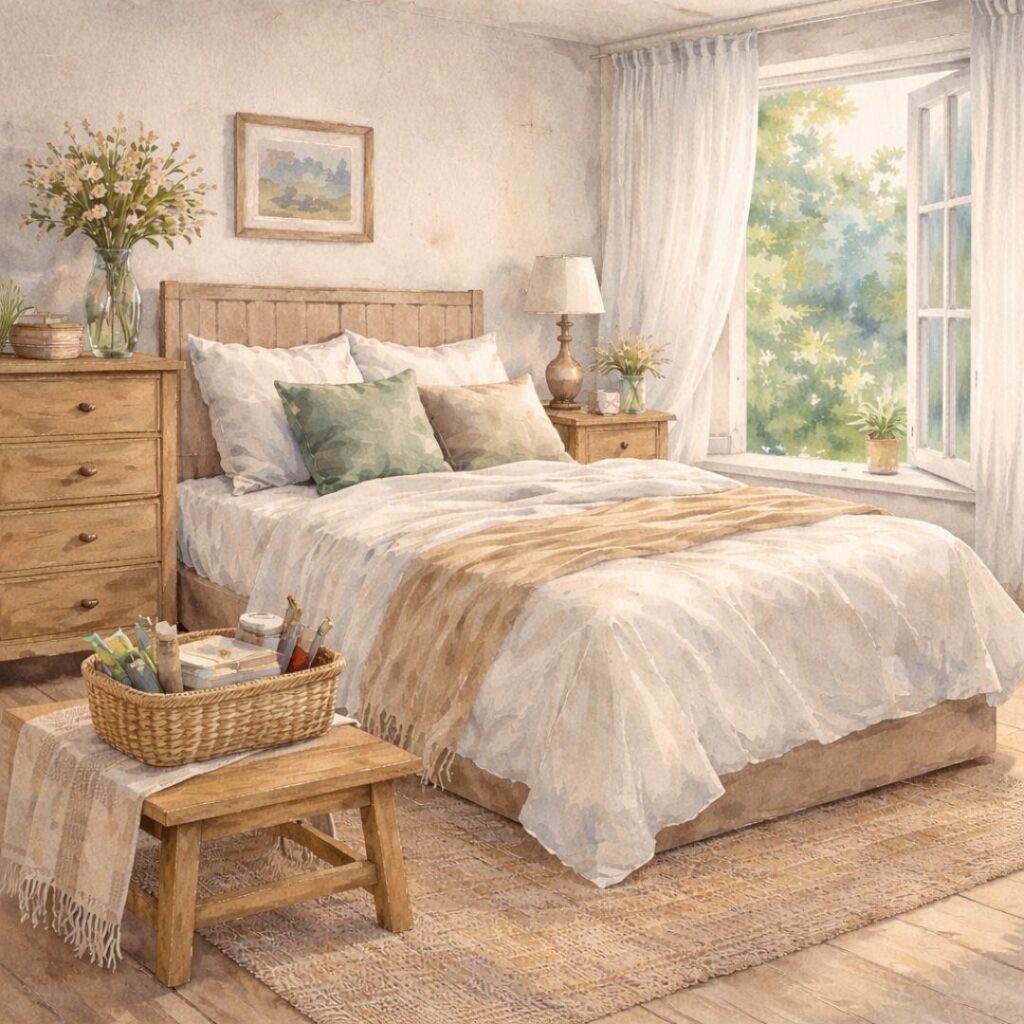 A wooden nightstand, a woven basket, a ceramic lamp, or a linen curtain can quietly shift your room into a softer register.