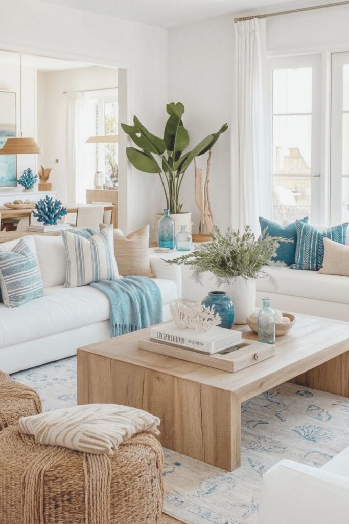 A natural fiber rug adds texture and warmth while keeping that organic coastal feel.