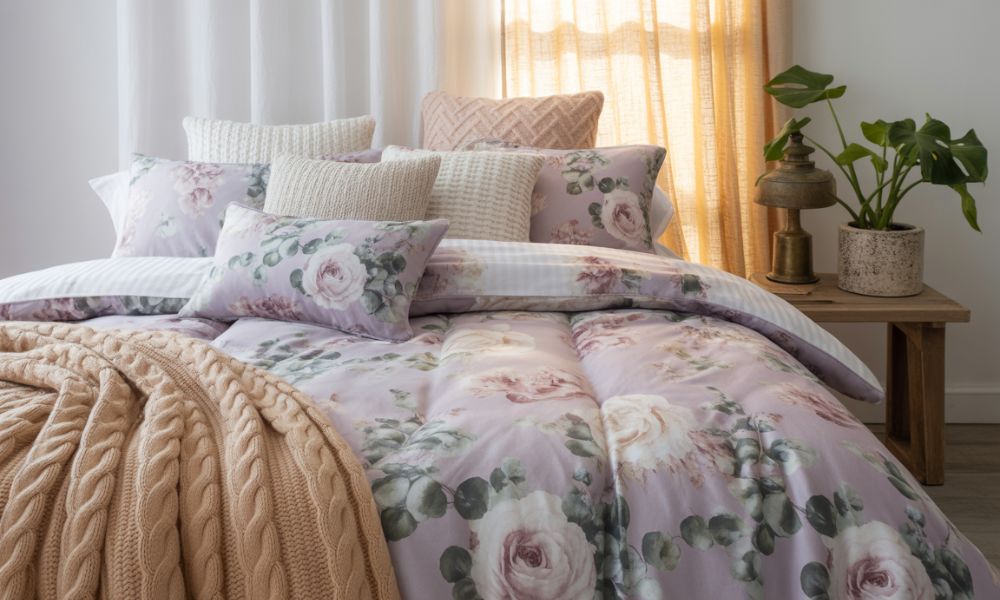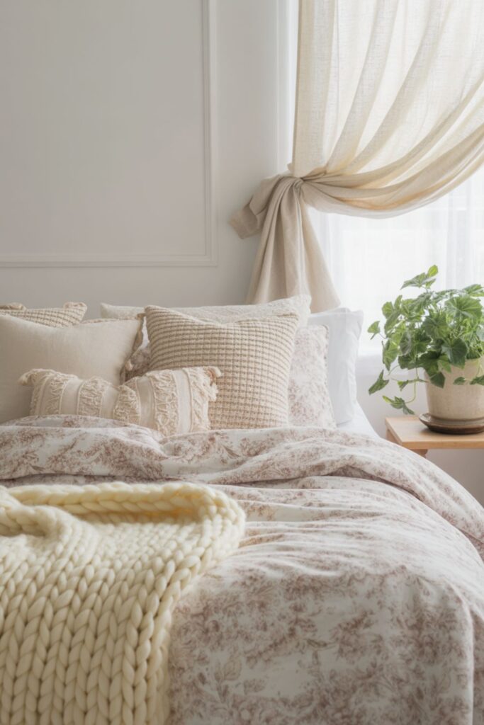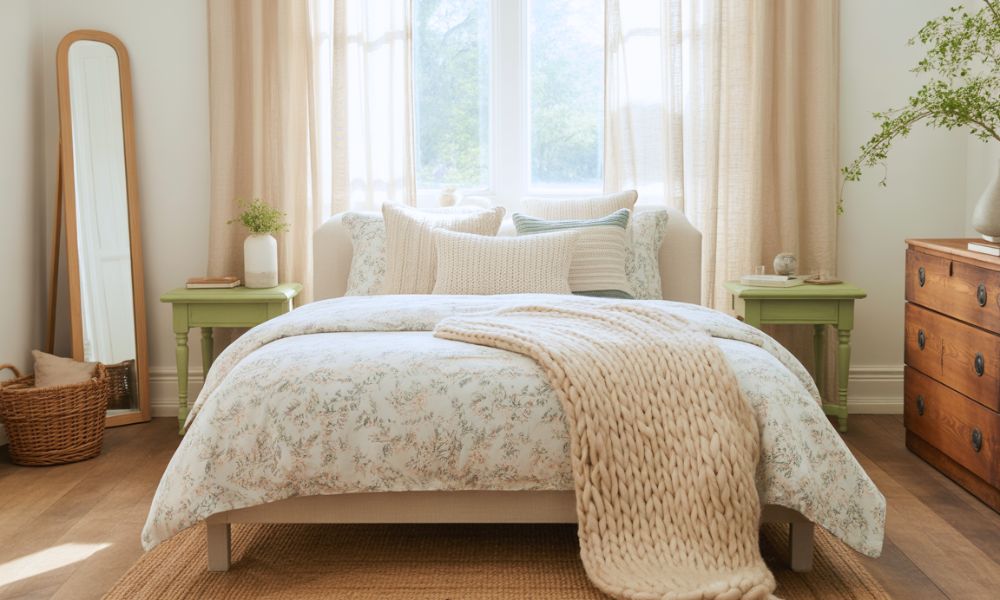 Cottagecore beds should look inviting and slightly undone. Layer quilts, coverlets, duvets, and throws instead of relying on a single comforter. A mix of textures — cotton, linen, lace, and lightweight knits — adds depth and visual interest.
