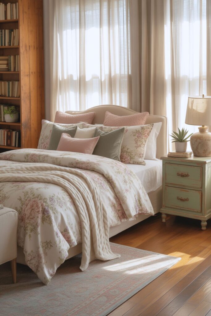 Softly painted furniture in white, cream, sage, or pale blue adds a romantic cottage feel. Distressed finishes or brushstrokes only enhance the aesthetic.