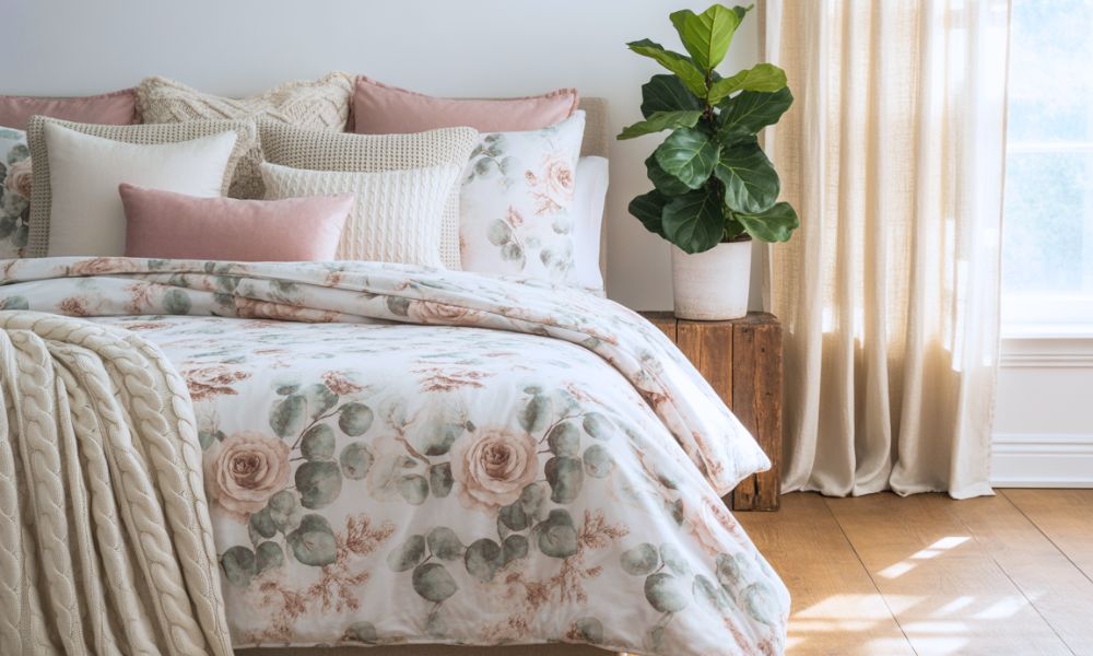While floral bedding steals the show, neutral sheets in white, cream, or soft beige keep the look balanced and serene. Linen or cotton percale works especially well.