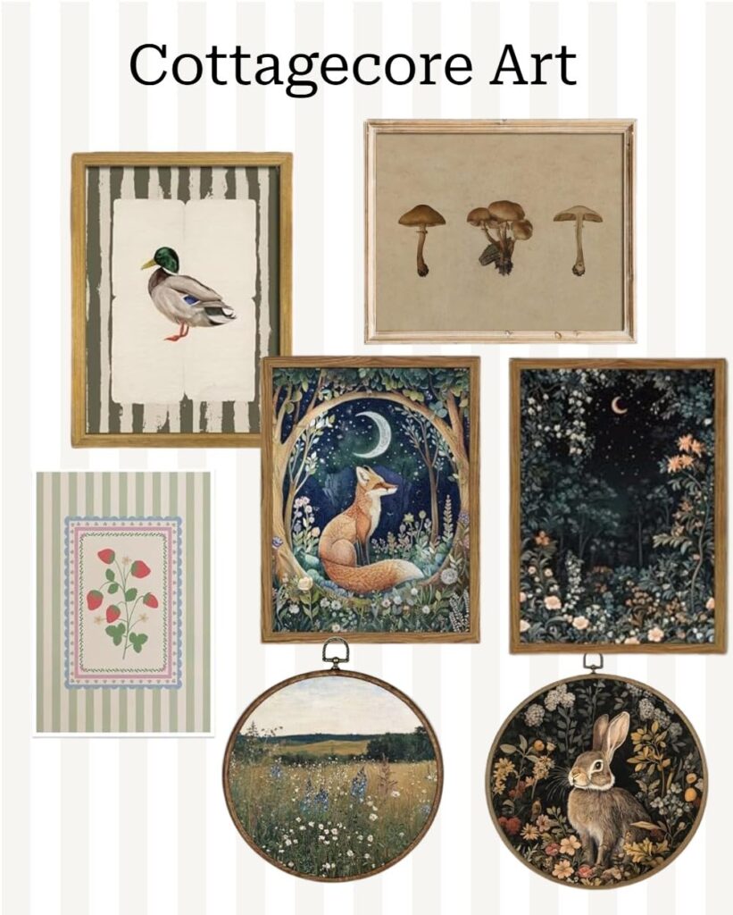 Artwork featuring flowers, plants, landscapes, or vintage illustrations fits beautifully in a cottagecore bedroom. Gilded frames, wooden frames, or distressed finishes enhance the charm.